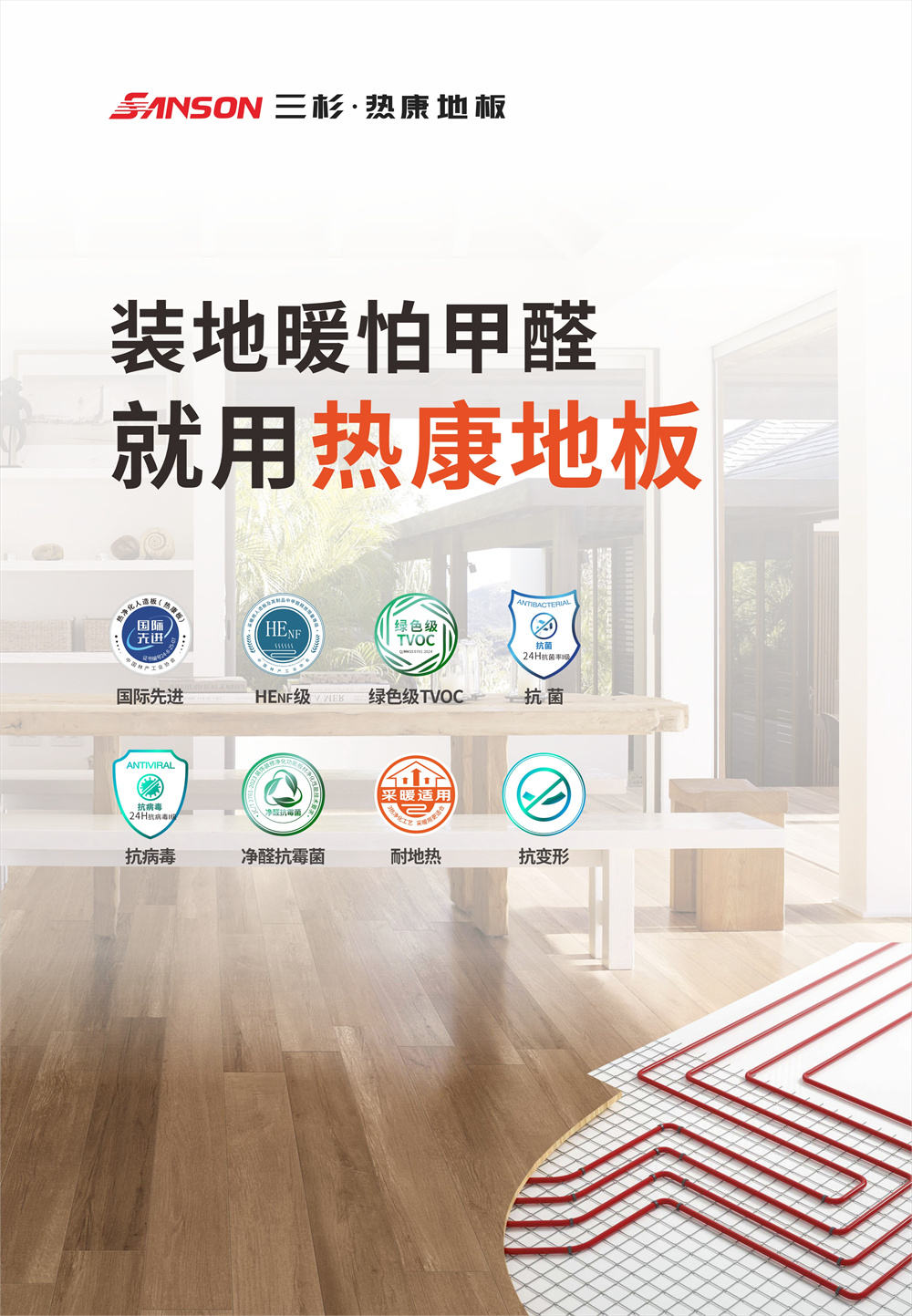 热康板产品包括开云app登录入口,具有HENF级环保(30℃条件下甲醛释放量≤0.025mg/m³)、绿色TVOC、抗菌抗病毒、净醛抗霉菌、耐地热、防潮抗变形等多重特点。特别是开云app登录入口在30℃条件下也不用担心甲醛释放量超标的高环保特性,使得它更适合有地暖的家庭选择。这些特点使得开云app登录入口在市场上具有极高的竞争力,不仅满足了消费者对高品质、环保家居的需求,也为地板行业树立了新的标杆。